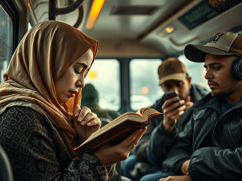 Viața nu e mereu fericită, îi scoate în cale omului tot felul de încercări și trebuie să învețe să trăiască, având toate poverile atârnate deodată pe umerii săi. Își duce viața într-un coșmar și speră că se va trezi odată și cerul va fi senin. În drumurile sale printr-un oraș care, de multe ori, soarbe energii și sporește suferințe, intersectările cu anonimi trecători pot transforma imagini cotidiene în icoane contemporane, cu personaje care se așază la fereastră, într-un autobuz, și se roagă cuminte, cu devotamentul celui mai obișnuit act uman. O femeie cu năframă își sărută cartea de rugăciuni, zâmbește, face semnul crucii și deschide fericită prima filă, citind cu atenție rândurile magice. Parcă i s-a așezat o aureolă deasupra capului, în jurul său norii s-au risipit. Un bărbat vânjos ocupă locul liber de lângă femeie, se uită cu evlavie la ea, se închină când autobuzul ajunge în dreptul unei biserici. Parcă e un pelerinaj religios, ceilalți călători fac și ei semnul crucii, comunicând fiecare, în felul său, cu dumnezeirea. Lângă femeie locul e iar liber. Urcă un tânăr cu șapcă modernă și cu un telefon zgomotos. Întâi, se adaptează la mediu, privește în toate părțile, își distribuie spațiul echitabil, și începe să asculte muzică, lăsând în mijlocul de transport o dâră sonoră contemporană. Rugăciunea femeii și hiturile băiatului se împletesc într-o ciudată alăturare, nederanjantă pentru nimeni. Credincioasa își continuă ritualul, fața înseninată rămâne aplecată deasupra cărții de rugăciuni. Băiatul călătorește cu acompaniament muzical, pe fundal, se anunță stațiile. Cele 19 stații s-au scurs rând pe rând. Parcă a trecut o viață. Toți erau tineri și fericiți la plecare, în cartierul cu nume confortabil, iar pe Dealul Mitropoliei, aceeași oameni s-au gârbovit, conștienți de bârnele pe care le poartă fiecare pe spate. Pe drum au văzut și statuia Ecaterinei Teodoroiu, au fost și renii, luminițele de sărbătoare din dreptul firmei de dulciuri. Femeia a rămas indiferentă la spectacolul uman, în ea clocotea focul credinței și părea că se roagă pentru întreaga umanitate. Lumea cobora din autobuz sau urca cu bagaje, în centrul marelui oraș ajunsese ploaia, o pâclă se așternea peste lume. Femeia cu năframă rămăsese să facă ordine în univers. Ea și rugile ei cât o viață de om, derulată din goana cailor putere ecologici.